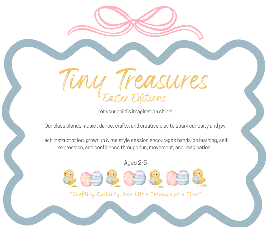 Tiny Treasures is a 60-minute, teacher led, child/parent participation class filled with music, dance, crafts and creative play.